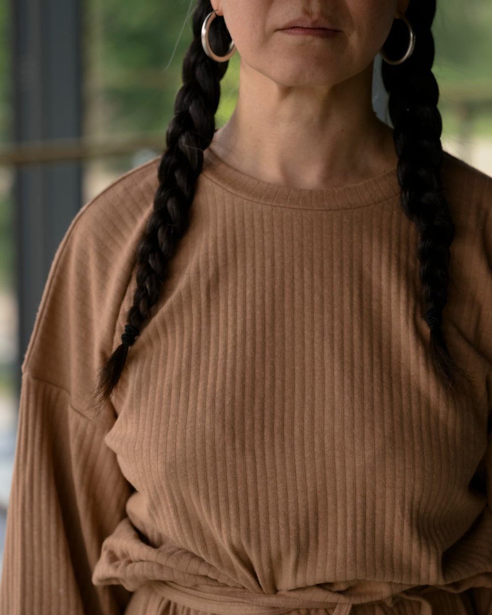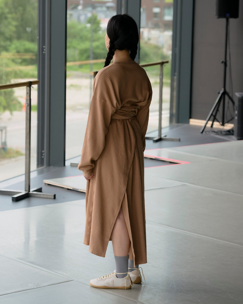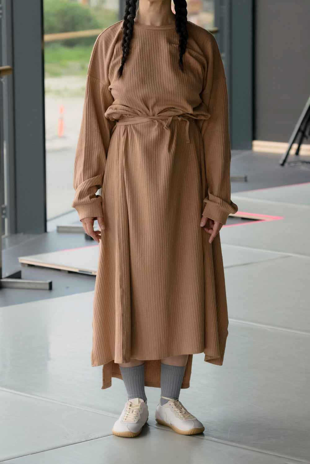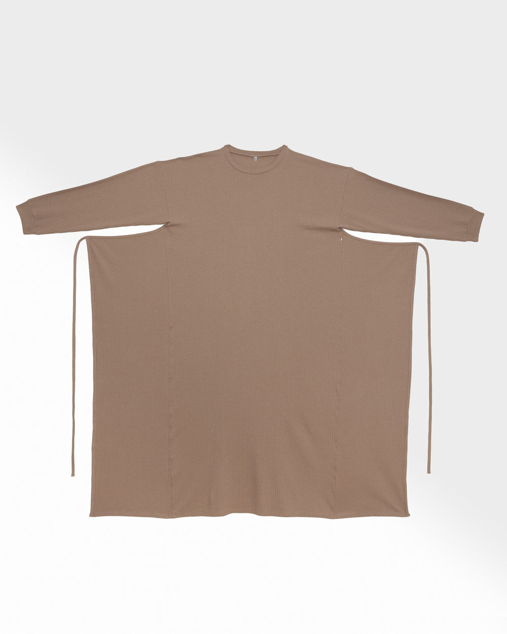 BASERANGE long-sleeved dress with drawstring waist, part of the DRSH collection, Portugal. BAS-DRSH-CR-SP26-LB (LABURNUM BROWN)