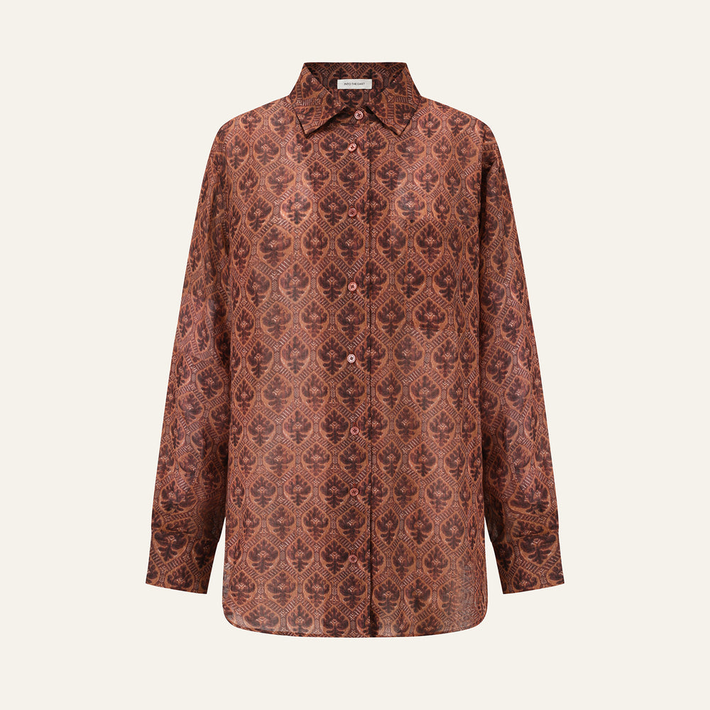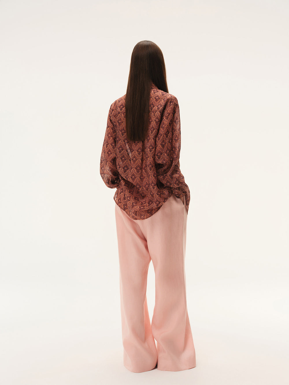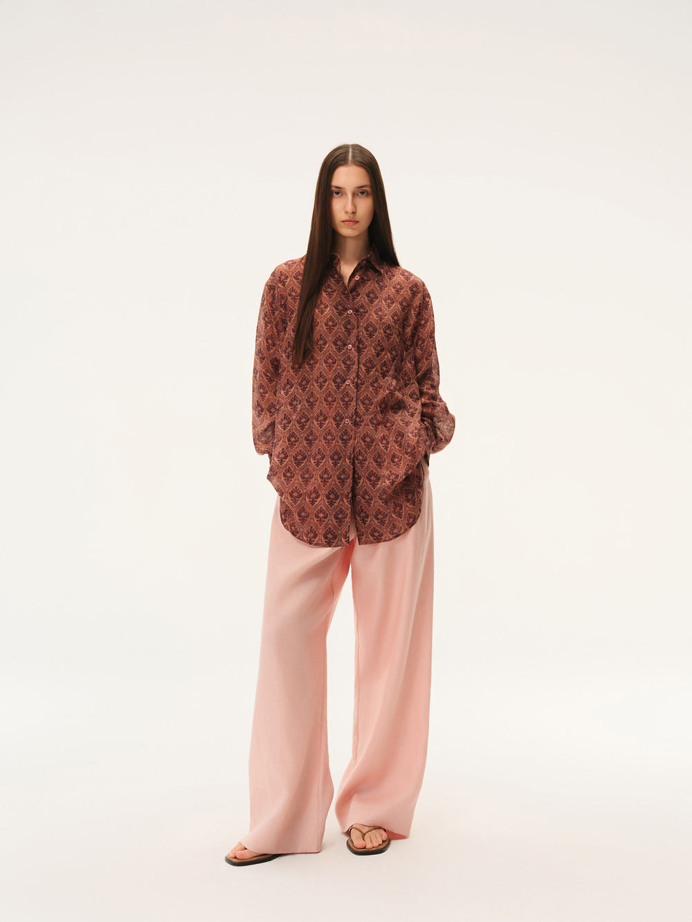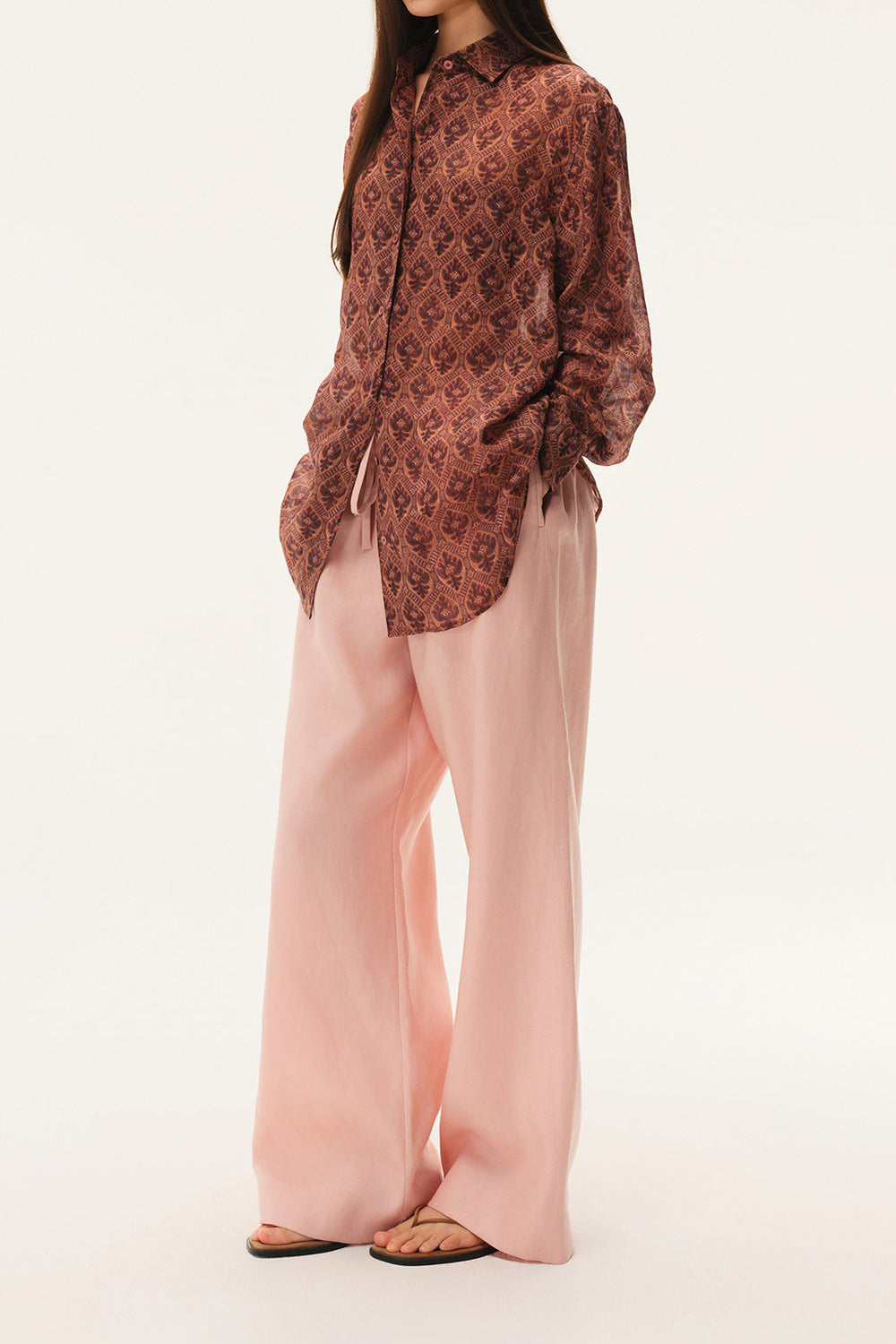 INTO THE EAST Spring/Summer 2026 Floral, Bird, and Tree Collared Shirt / Embroidered Elastic Waist Straight Leg Pants ITE-E1JBSSSH21009RE-SLH Shirt
