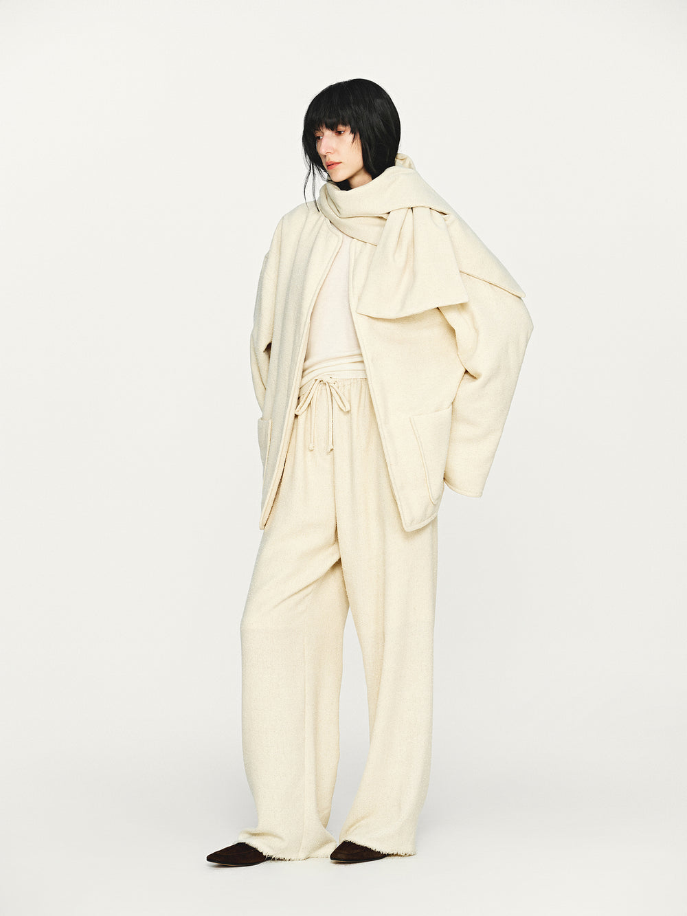INTO THE EAST 25 Autumn/Winter Ivory White Textured Scarf/Cotton Jacket with Frayed Edges Straight Leg Pants ITE-E1DGAW105IY20PT-XYB Pants (ITE-E1DGAW102IY20JK)