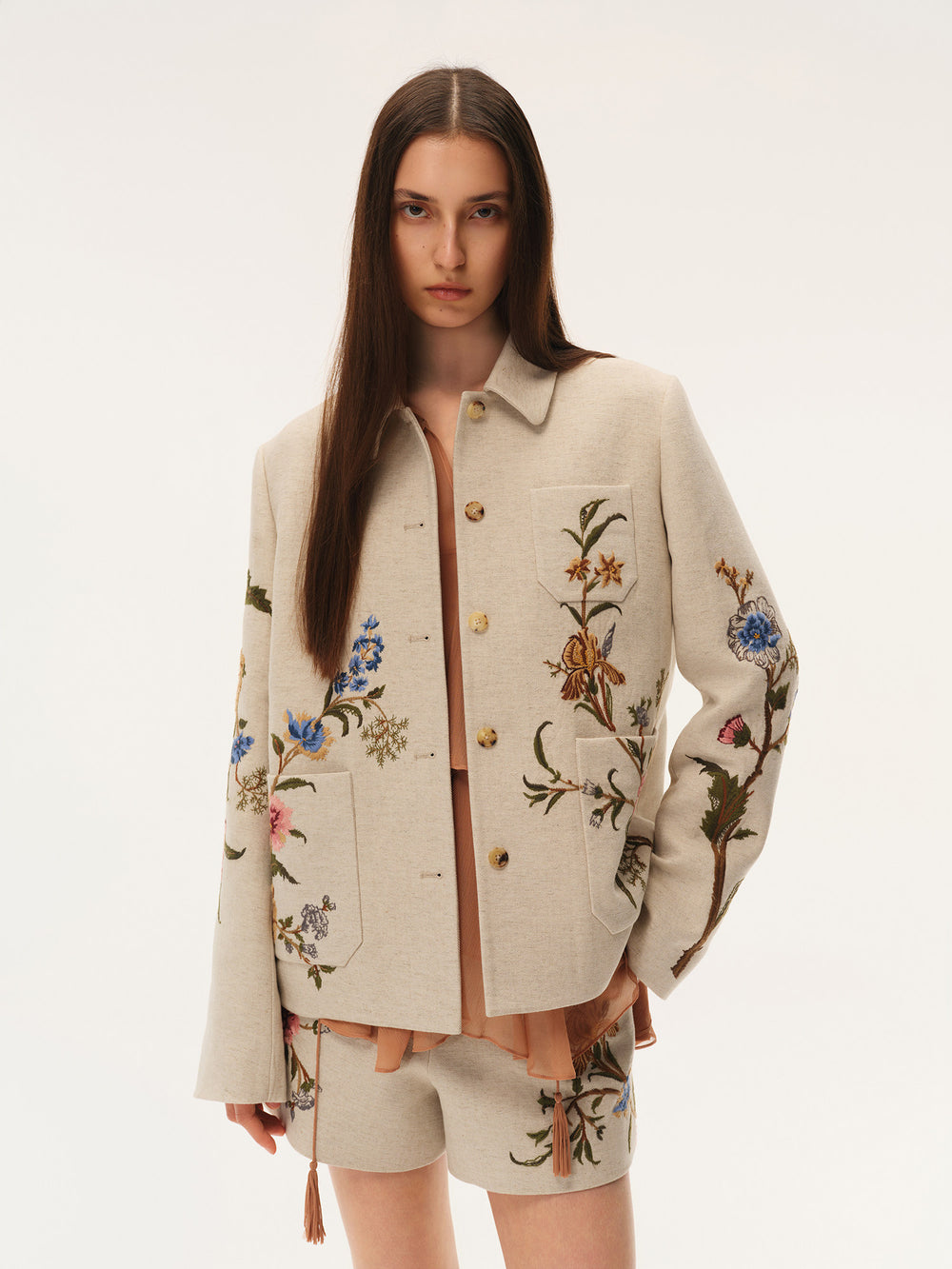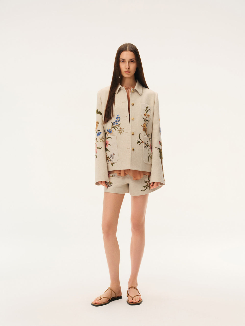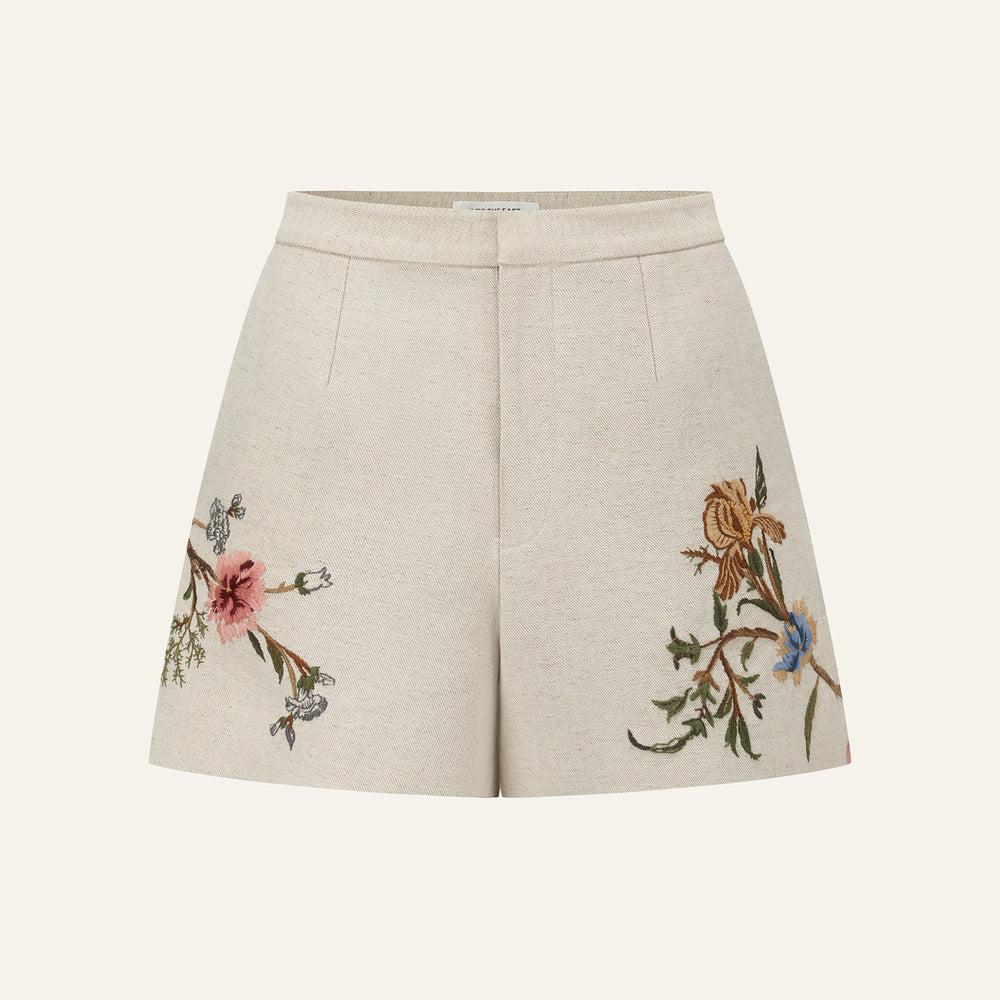 INTO THE EAST Spring/Summer 2026 Floral, Bird, and Tree Embroidered Shorts ITE-E1JBSSPT22019BGE-MB Off-white
