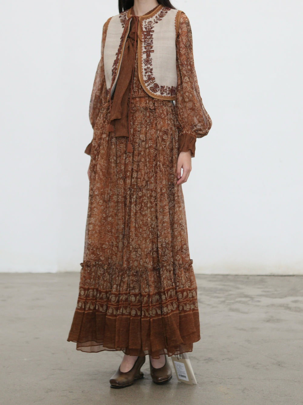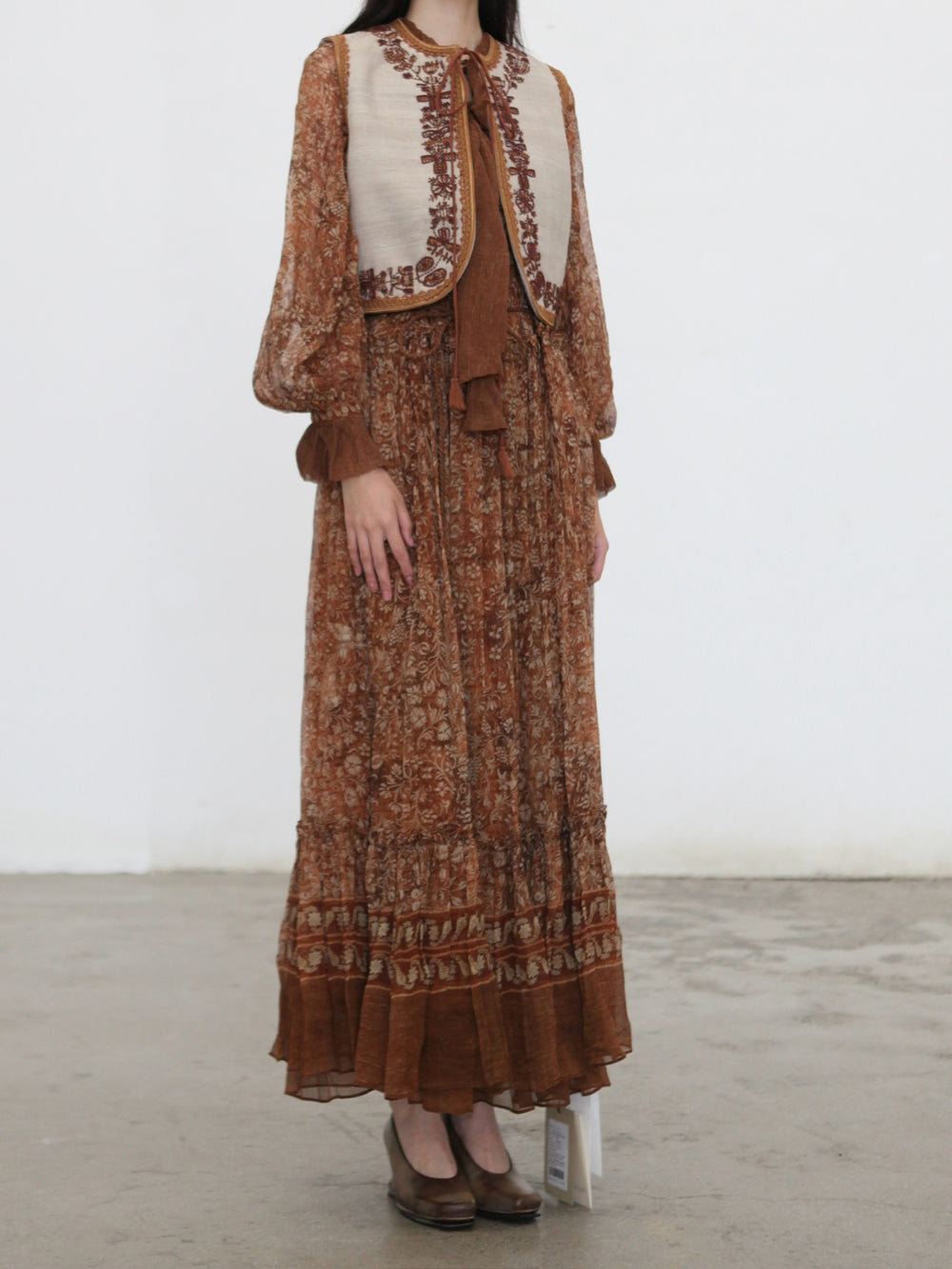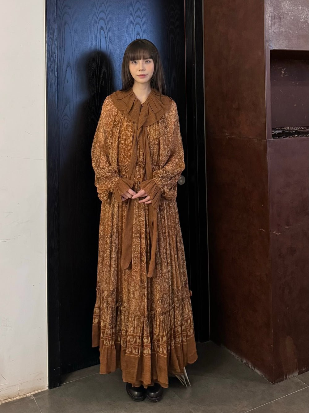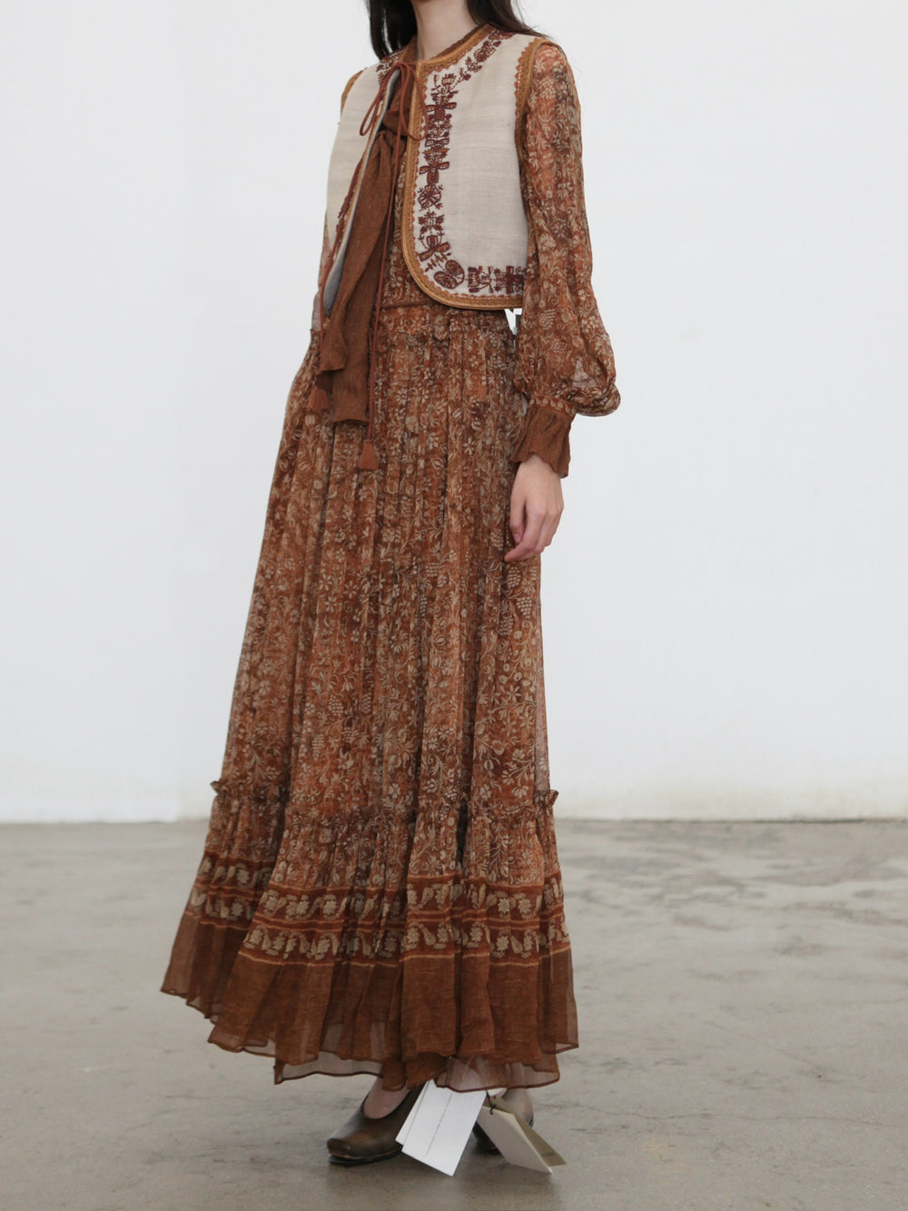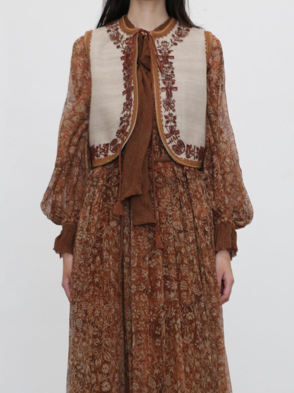 INTO THE EAST25 Autumn/Winter Brown Floral Ruffle Collar Silk Dress/Beaded Drawstring Vest ITE-E1DGAW133TN21DS-HE Dress