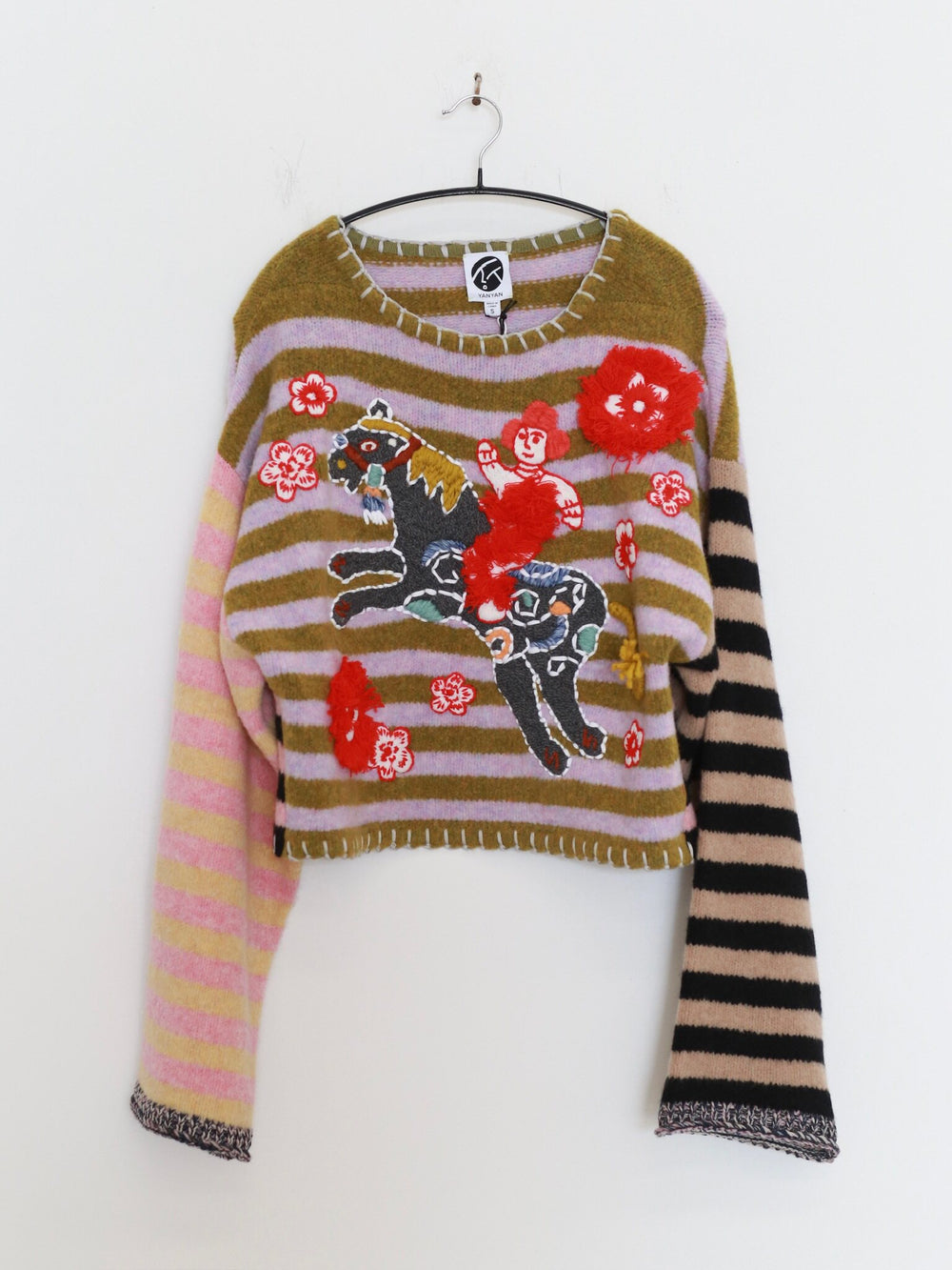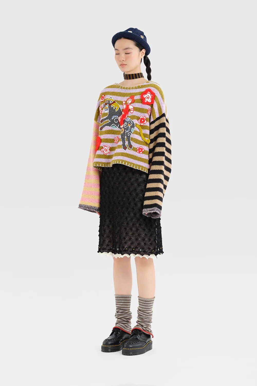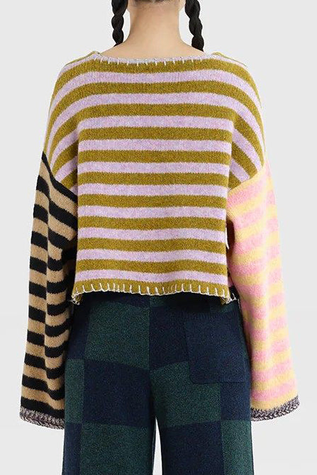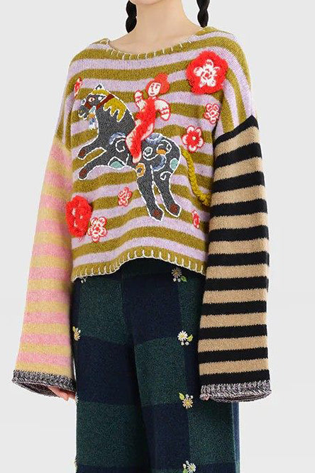 YANYAN KNITS Plush Horse Pattern Boat Neck Pullover Sweater YYK-YYW25-1491-PIN Color Block
