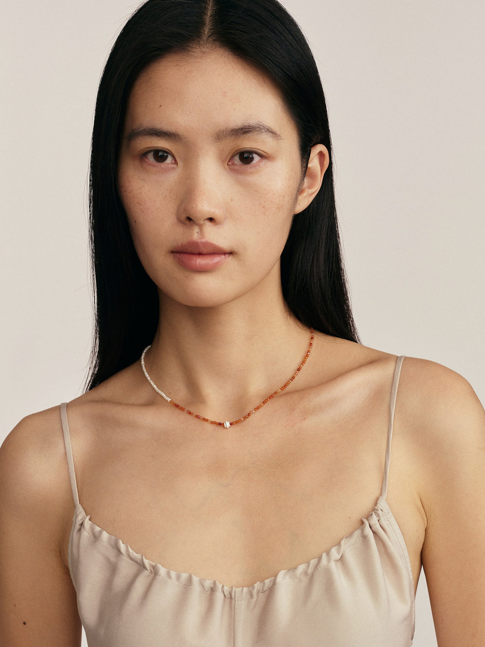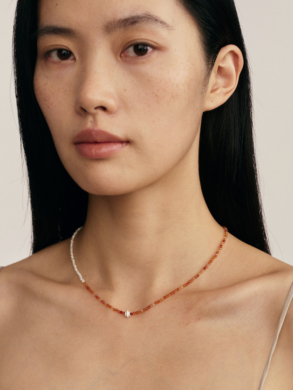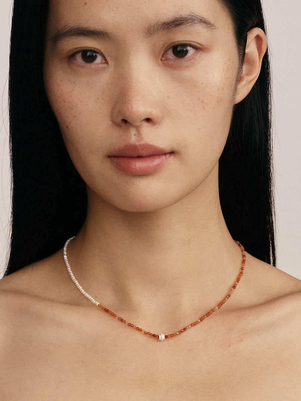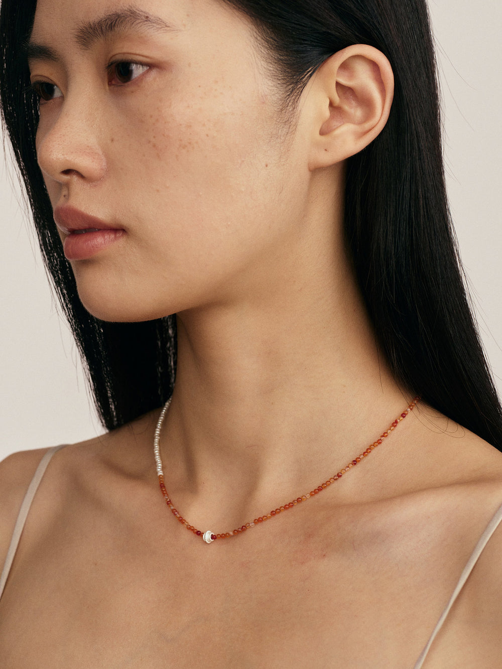OLIO E ACETO New Year Collection Red Agate and Pearl Patchwork Necklace OLIO-OA13N42-JHZZBY Orange-red/Pearl White/Silver