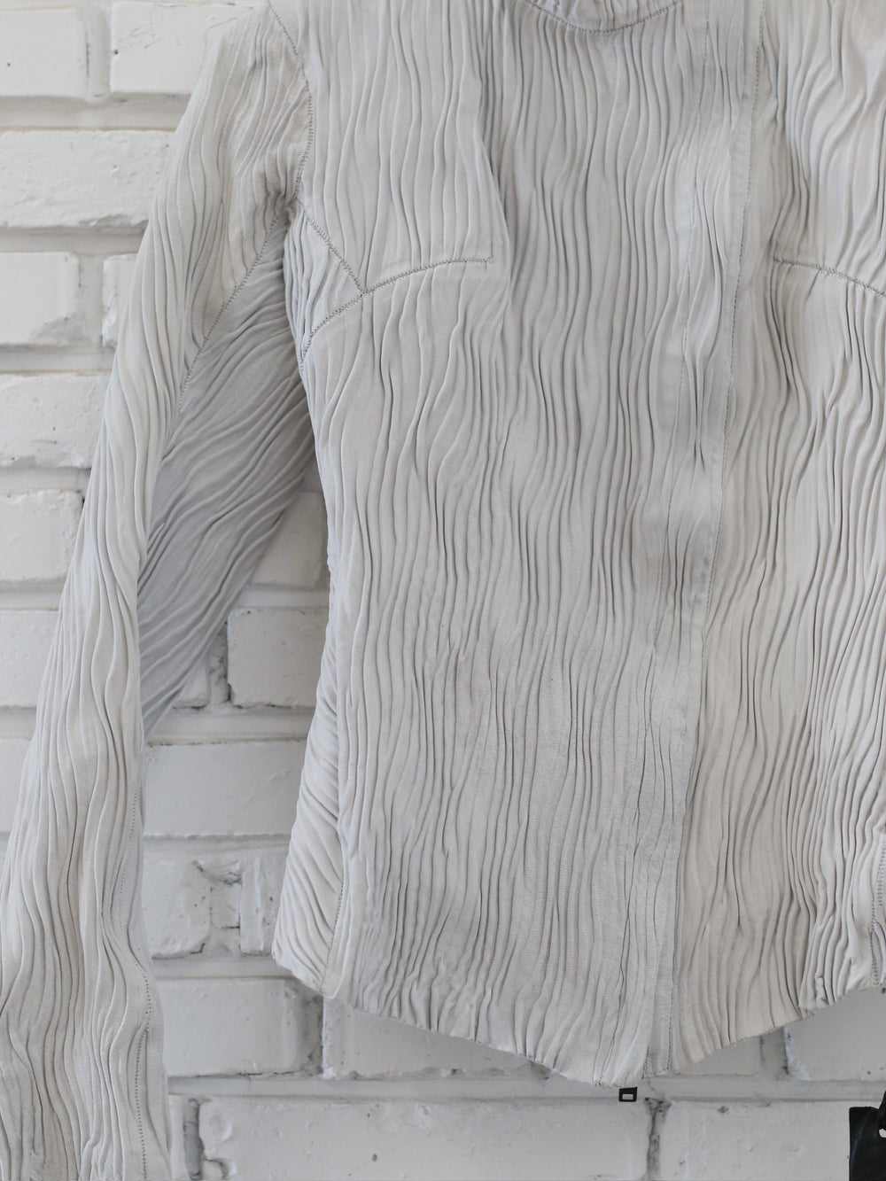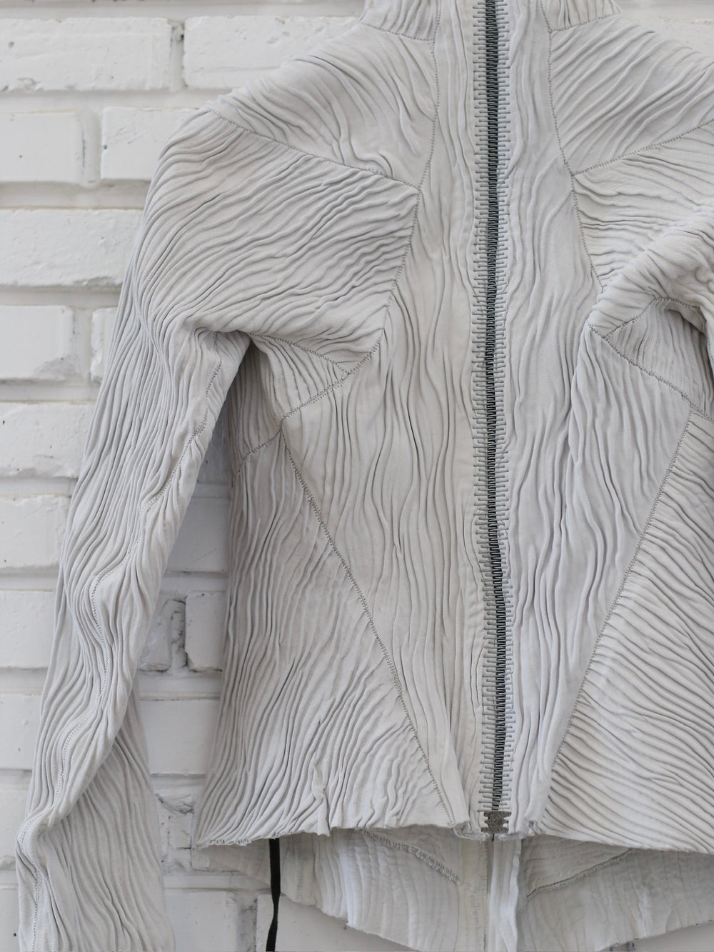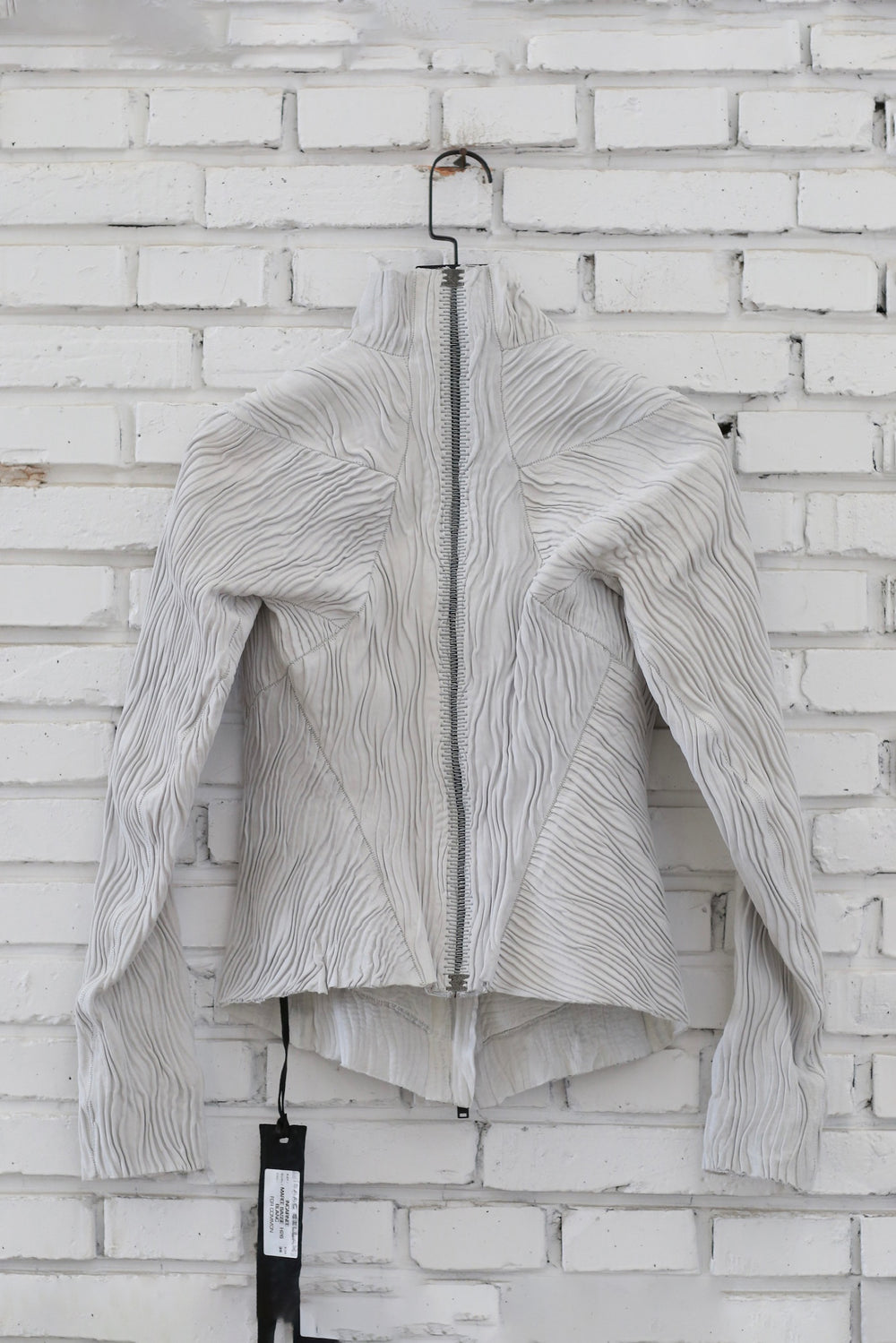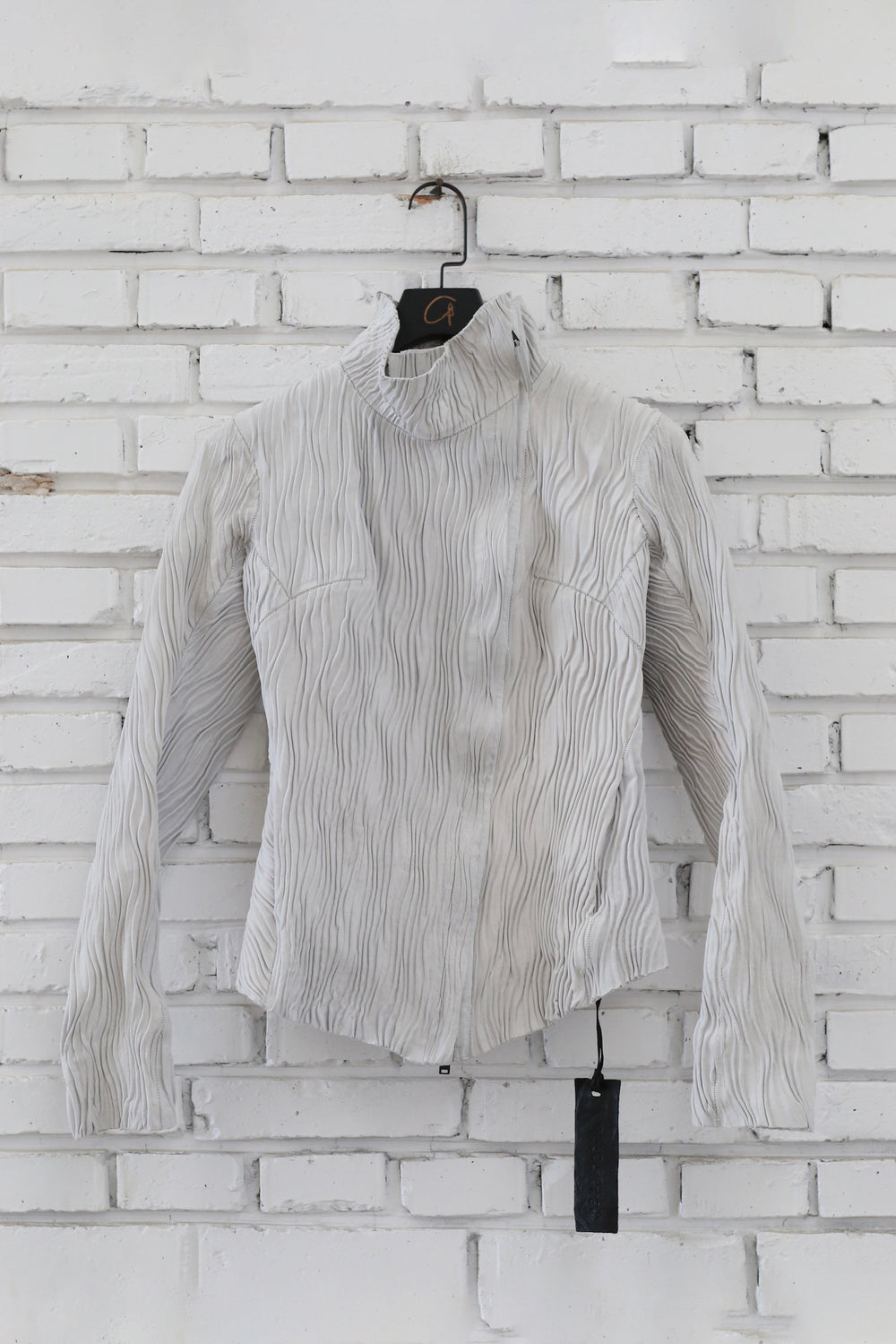 ISAAC Sellam Fall/Winter 2025 High-Neck Asymmetrical Pleated Leather Jacket, Lambskin, France. IS-INCARNÉE-MAREE BASSE-BLANC