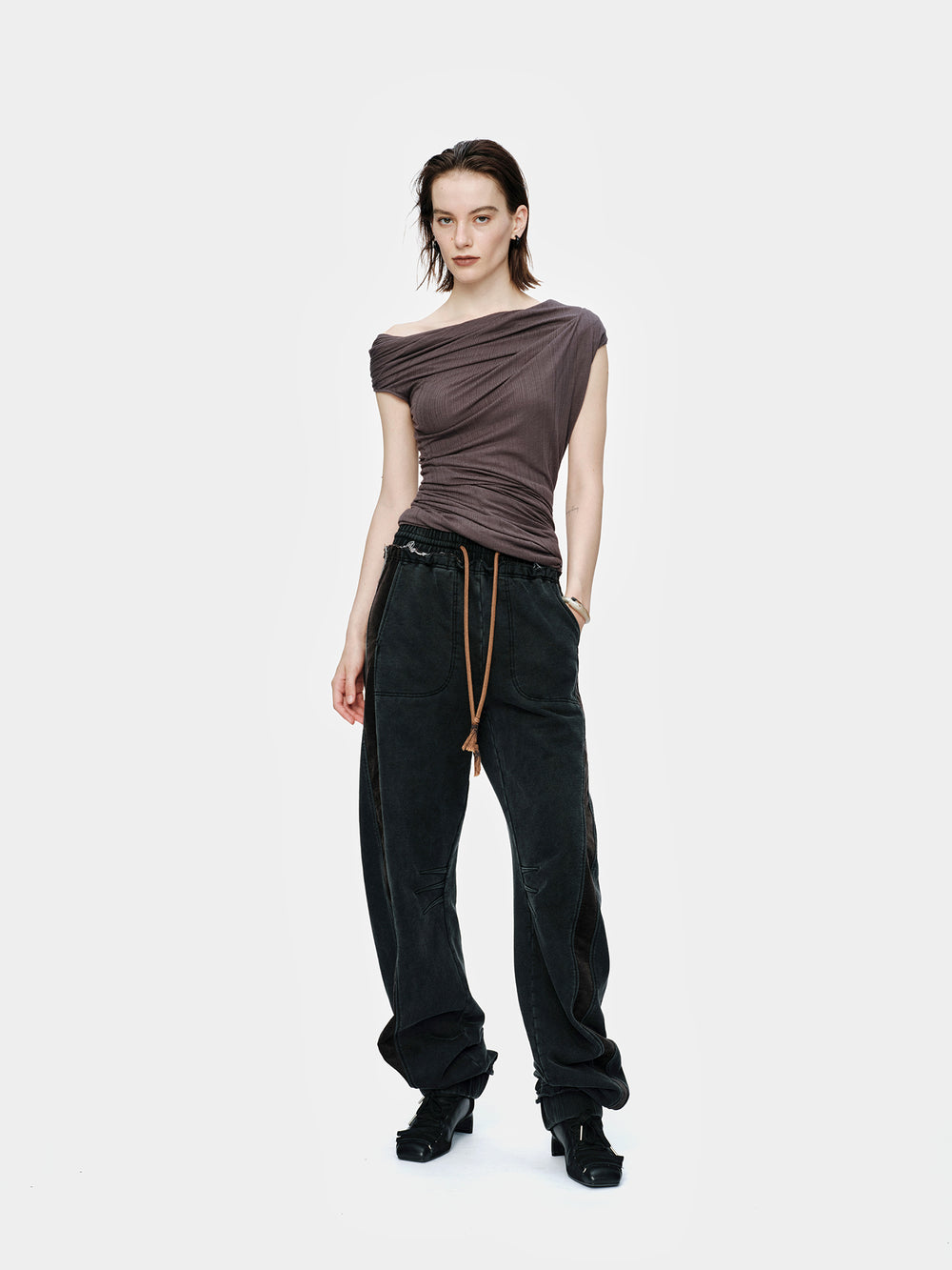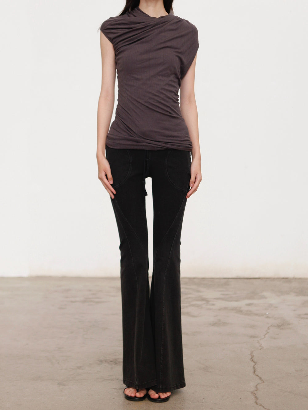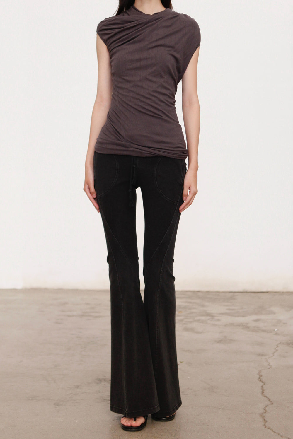OUDE WAAG 26 Early Spring Stretch Ribbed Top with Shoulder Trim OW-26RS-TP06T2-GY860 Dark Grey