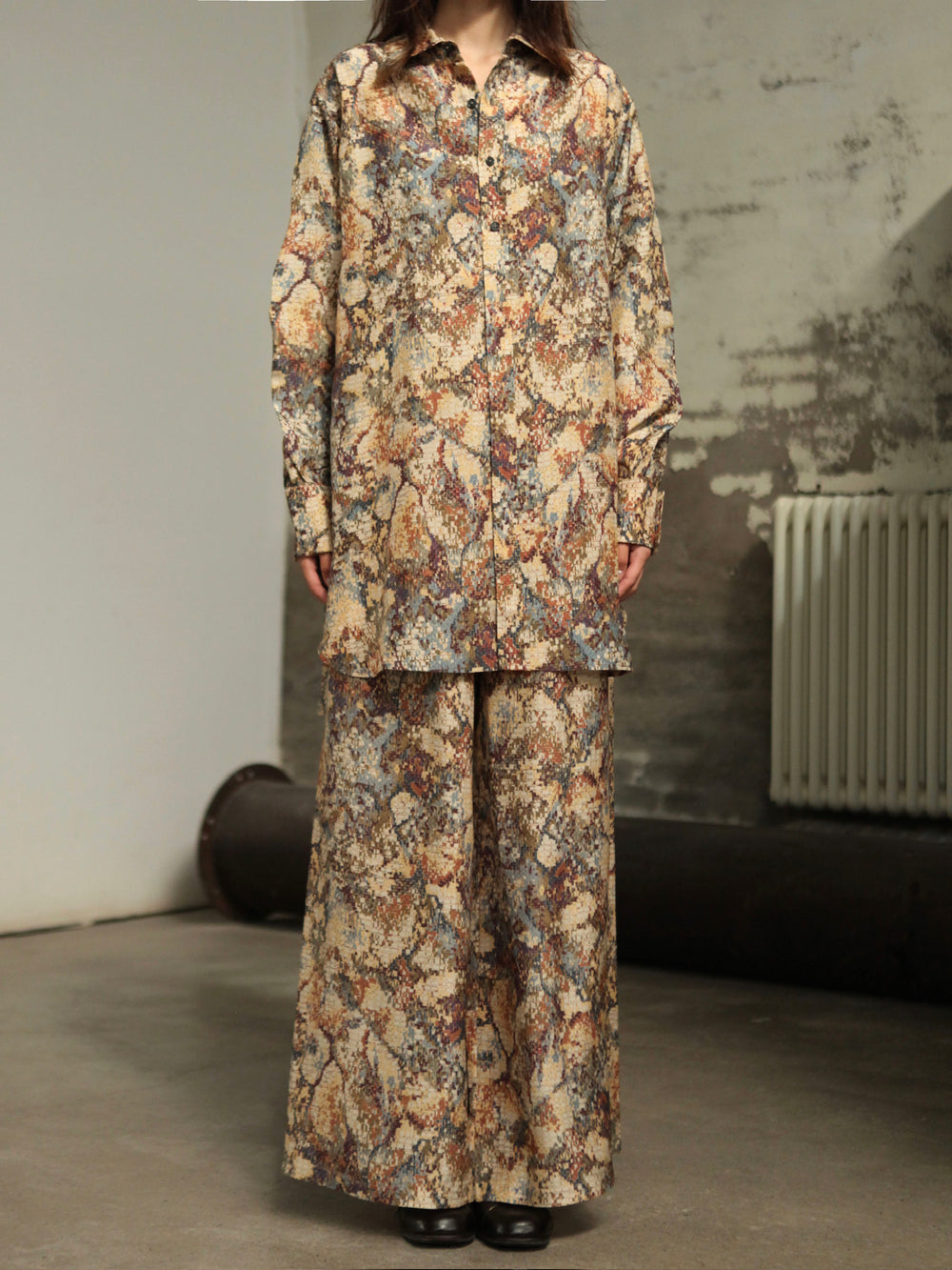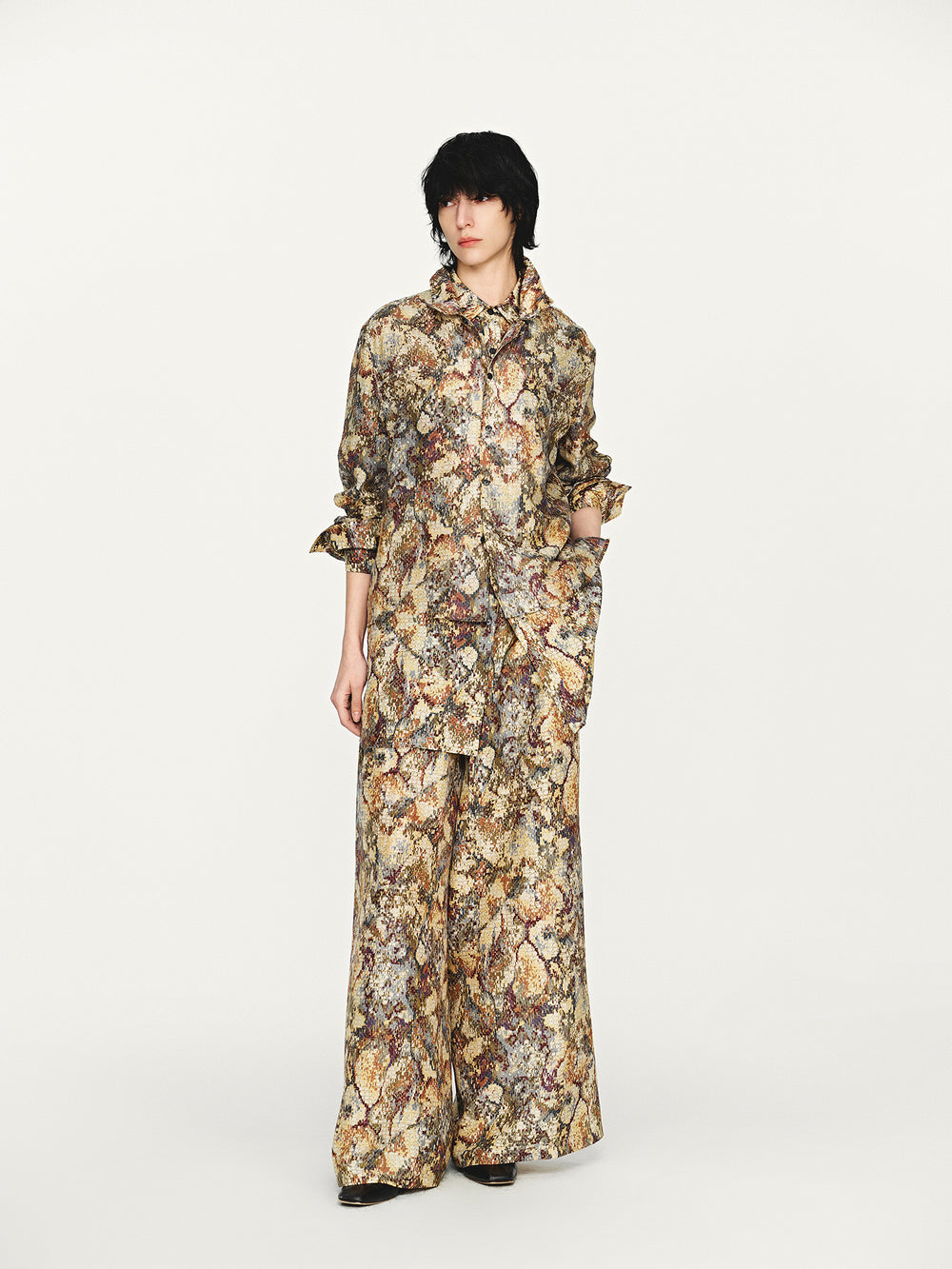 INTO THE EAST 25 Autumn/Winter Mosaic Molded Collar Silk/Cotton Shirt & Drawstring Straight Leg Pants ITE-E1DGAW082NCC21PT-HUA Pants (ITE-E1DGAW080NCC21SH)
