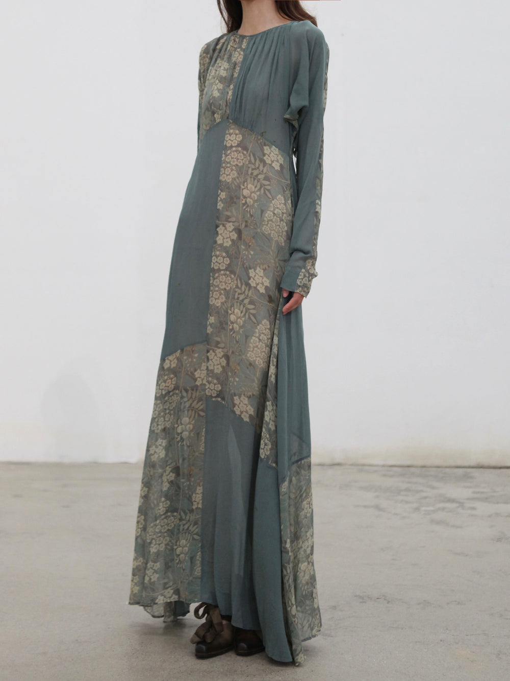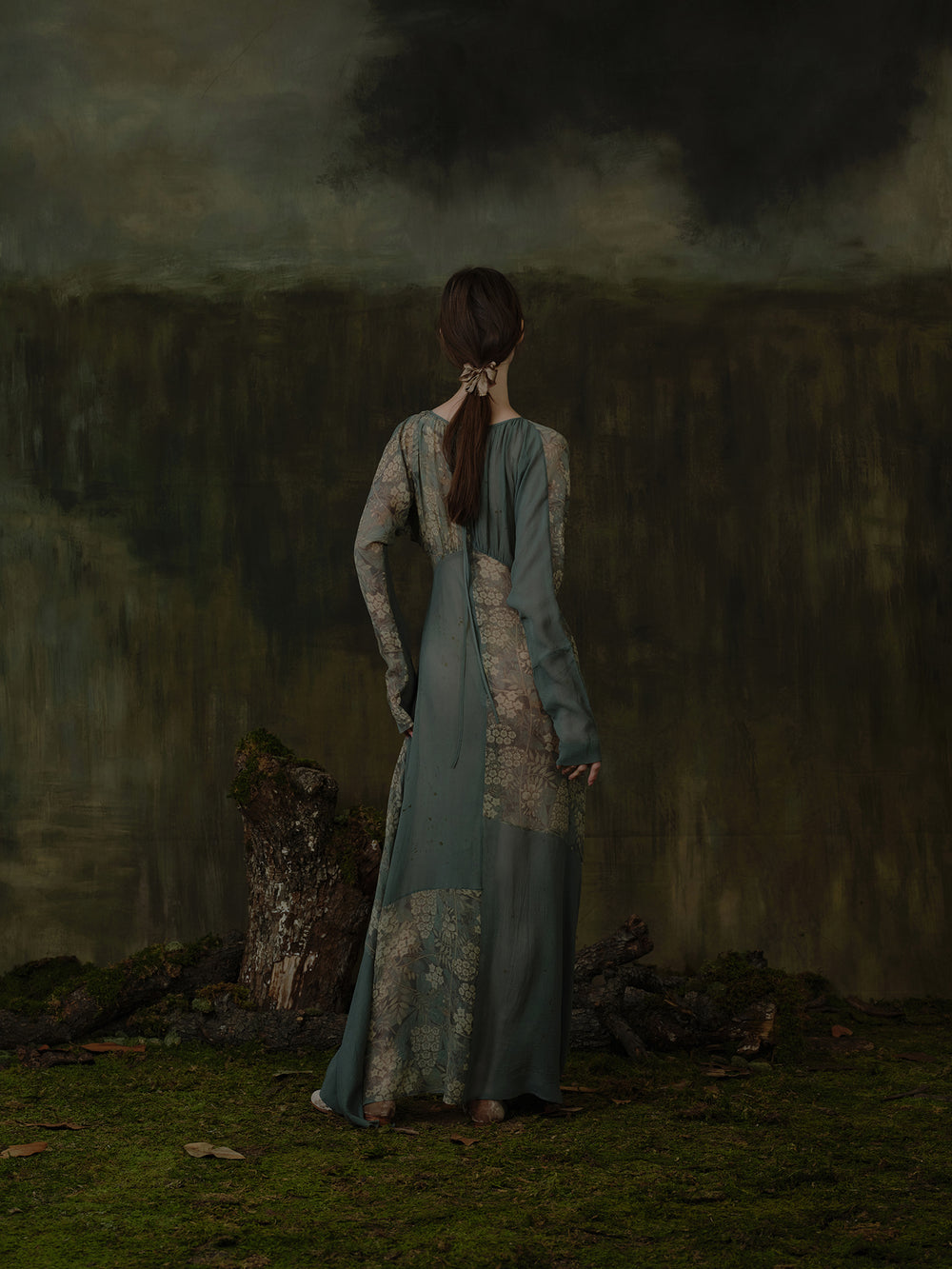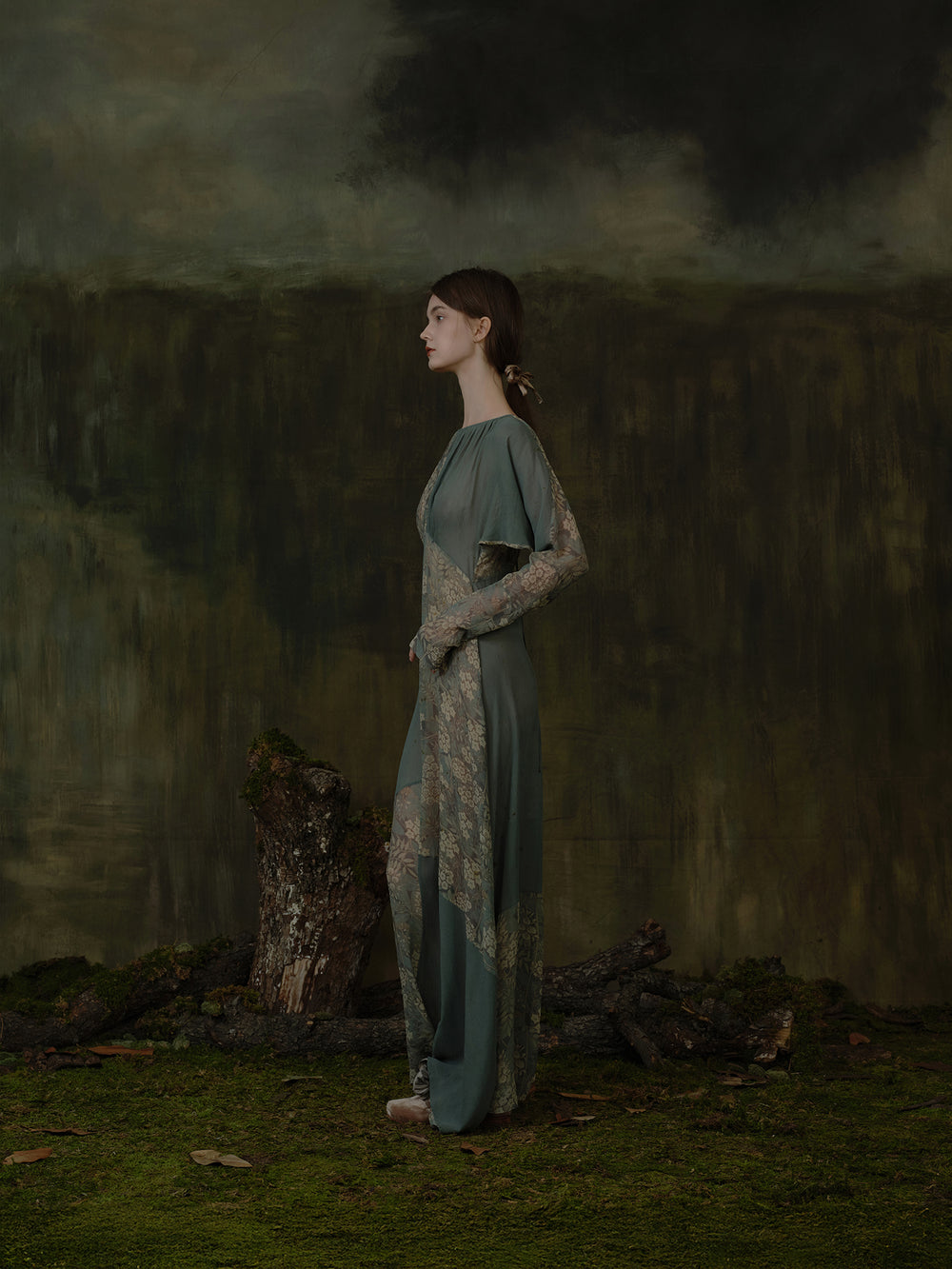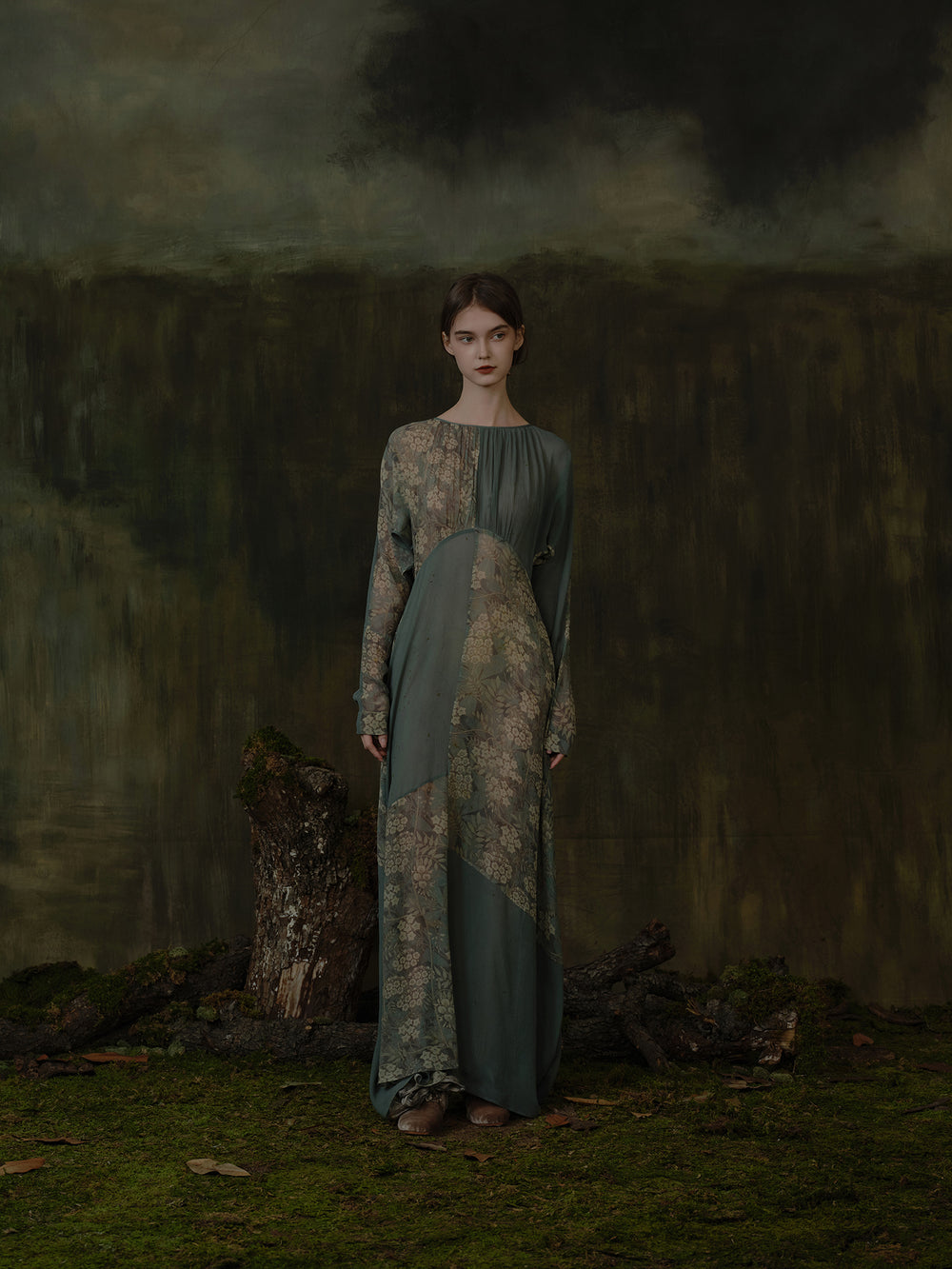 Mutedance 25 Autumn and Winter Waist Round Neck Splicing Dress MD-MD25FW60-green (MD25FW58)